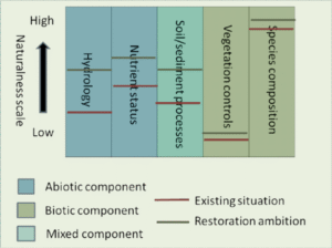 The restoration of natural processes such as a more natural hydrology (by restoring peatland) or a more natural vegetation control (using smaller, mixed flocks and/or control of wild grazers and browsers across a large landscape) should be the approach taken in some landscapes. However, this approach is best avoided in places where high quality examples of semi-natural habitats (like species-rich grasslands) might be affected, unless there is sufficient confidence that restoration measures would result in a net benefit, and that the process of change does not risk elimination of rare species or habitats that are characteristic of the locality.